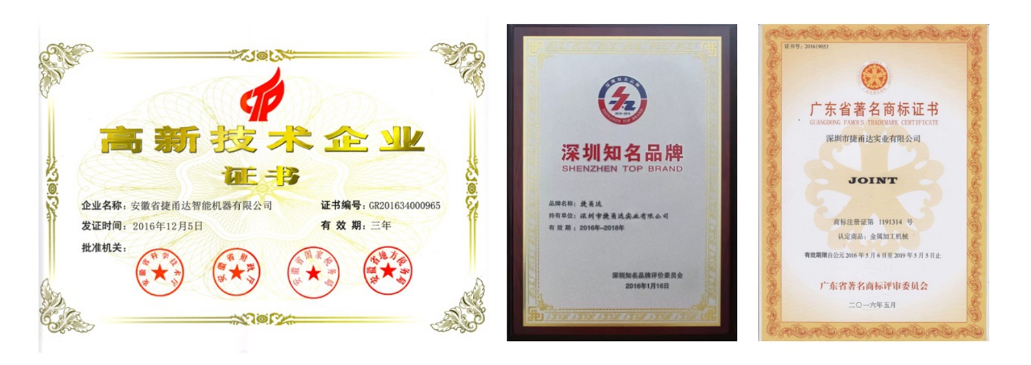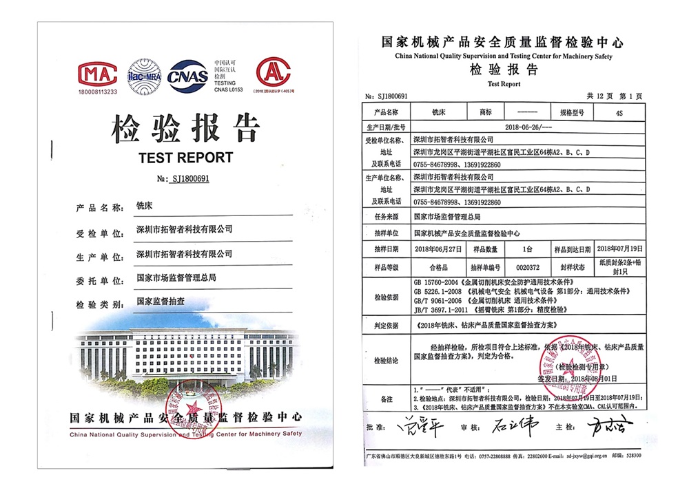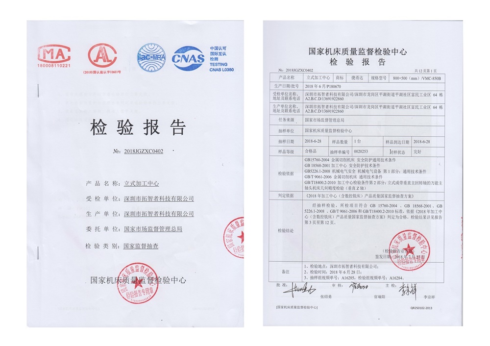 深圳市拓智者科技有限公司產(chǎn)品連續(xù)多年順利通過(guò)了國(guó)家市場(chǎng)監(jiān)督管理總局、國(guó)家質(zhì)量監(jiān)督檢疫總局質(zhì)量檢測(cè)并出具頒發(fā)權(quán)威的質(zhì)量檢驗(yàn)報(bào)告, 表明捷甬達(dá)機(jī)床的質(zhì)量制度、質(zhì)量保證能力等得到國(guó)家認(rèn)證機(jī)構(gòu)的認(rèn)可。