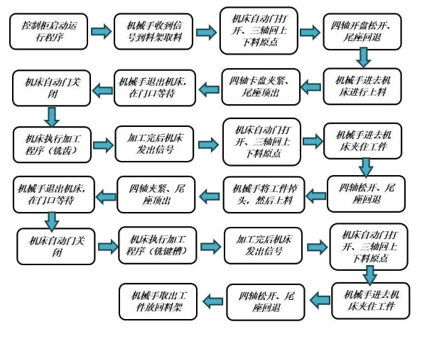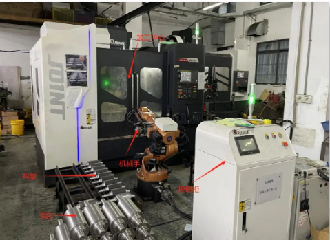 自動(dòng)化產(chǎn)線(xiàn)的上下料過(guò)程非常簡(jiǎn)單且高效。工人只需將毛坯放在料架上,啟動(dòng)產(chǎn)線(xiàn)自動(dòng)程序后,六關(guān)節(jié)機(jī)械手便會(huì)自動(dòng)抓取毛坯并將其送入加工中心進(jìn)行加工。加工完成后,機(jī)械手再將成品取出并放置在指定位置。整個(gè)過(guò)程無(wú)需人工干預(yù),既節(jié)省了時(shí)間又提高了安全性。