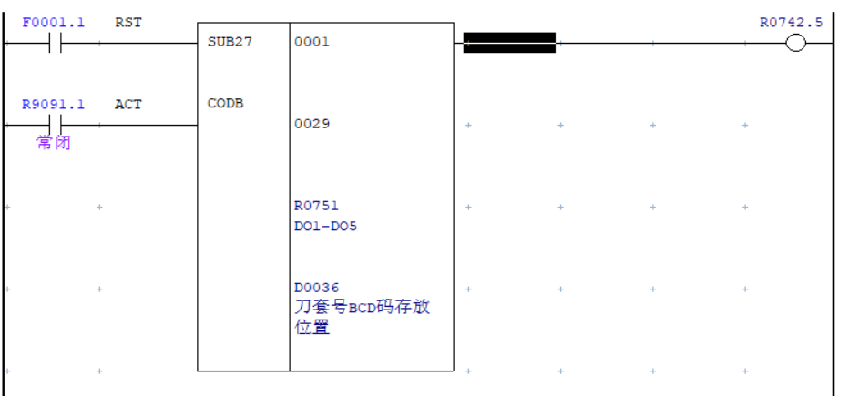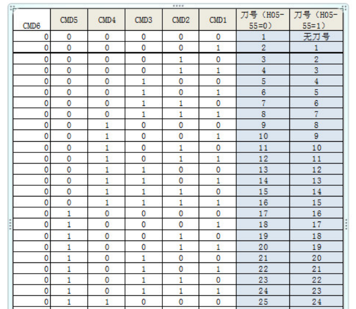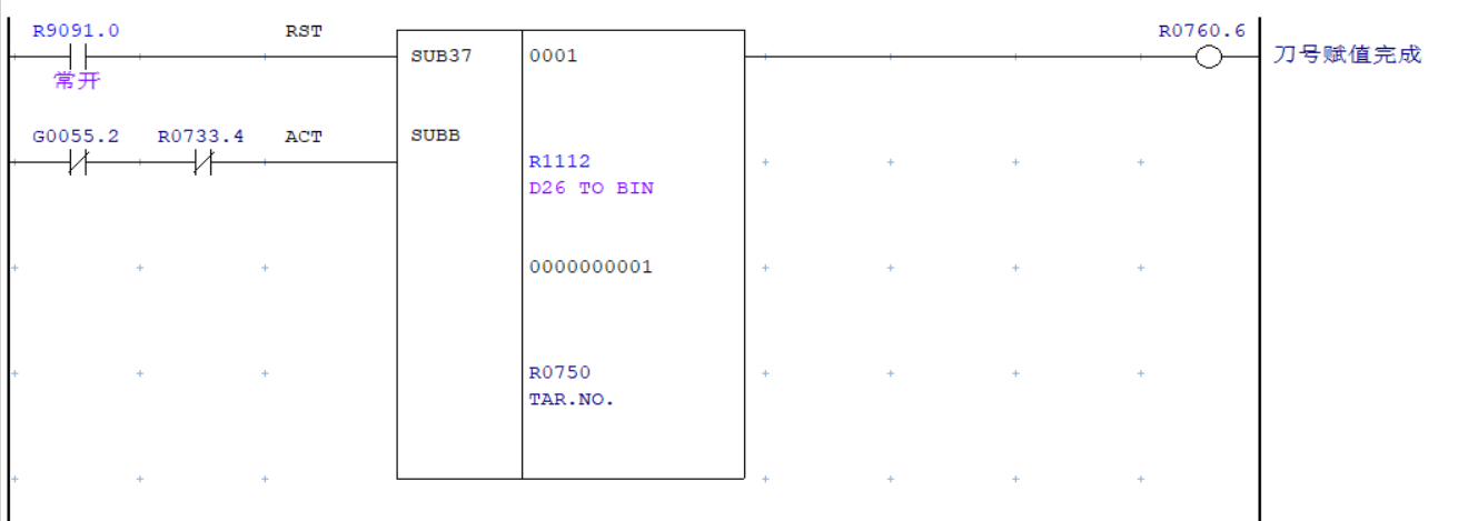 注:由于該款驅(qū)動器CMD DI 組合(CMD1-CMD1均為0)即輸入0時為1號刀,而且系統(tǒng)默認輸入1時為1號刀,因此使用SUB37(二進制減法)功能模塊進行刀號賦值傳輸。