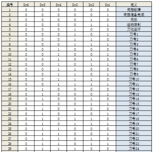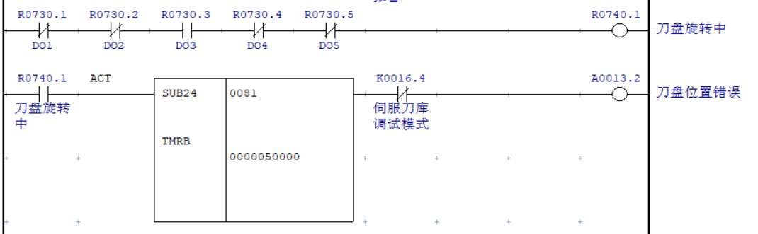 若刀盤旋轉(zhuǎn)選刀完成后刀盤位置錯誤,即出現(xiàn)DO狀態(tài)中僅DO3為“1”,其它均為0,情況下需輸出報警提示。一般情況下手動旋轉(zhuǎn)刀盤即可回正。若依然位置錯誤,使用寸動模式調(diào)整刀盤位置并重設(shè)原點也可解決。由于伺服刀庫進行選刀時,刀盤旋轉(zhuǎn)過程中也會伺服DO狀態(tài)中僅DO3為“1”,其它均為0的情況,因此該報警需延遲觸發(fā)。