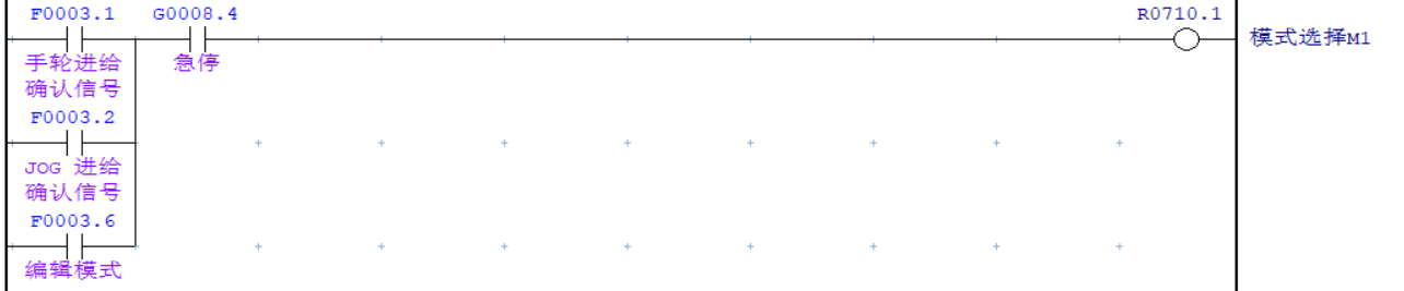伺服刀庫手動模式下,“模式選擇-M1”均為“1”,因此在可以將機床手動模式狀態(tài)(手輪,JOG,編輯)并列輸出“模式選擇-M1”為“1”