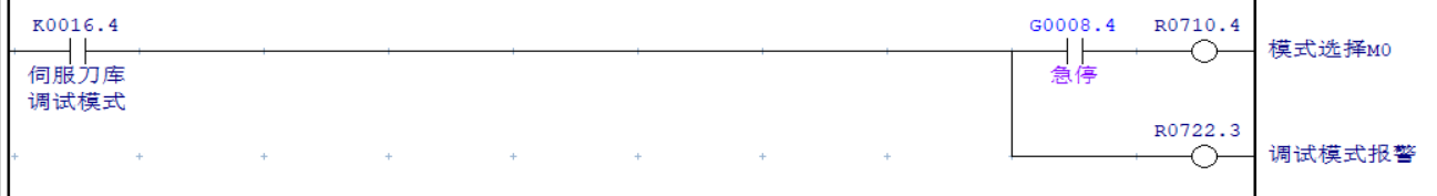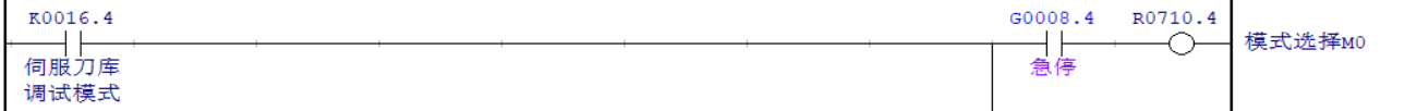 “模式選擇-M0”僅在刀庫寸動模式為“1”,該模式一般用于伺服刀庫的原點設(shè)置,屬于調(diào)試模式,機床正常使用過程無需用到該功能,因此使用K參數(shù)切換“0或1”的輸出。K參數(shù)開啟后,機床處于手動模式狀態(tài)(“模式選擇-M1”為“1”),即可激活伺服刀庫寸動模式。且進入該模式后刀庫處于調(diào)試模式,無法正常使用,同時需輸出刀庫處于調(diào)試模式的報警提示信息。