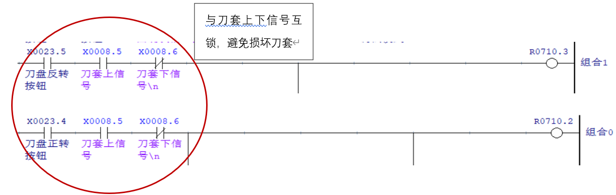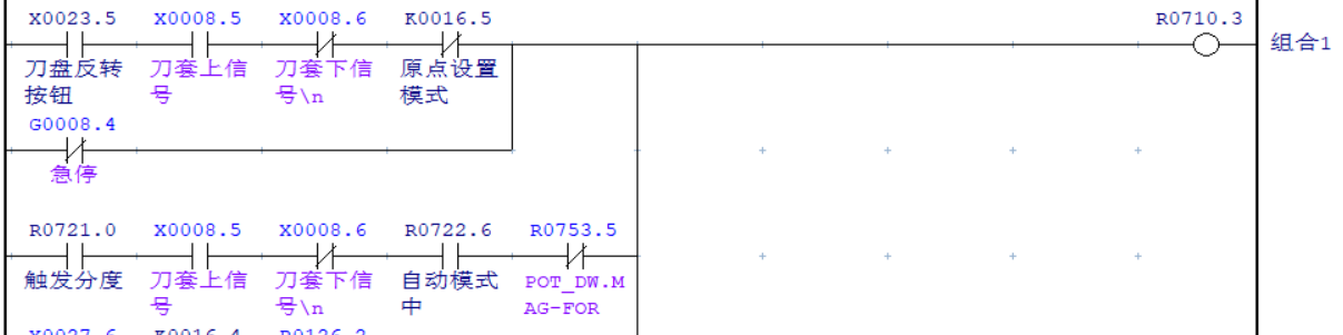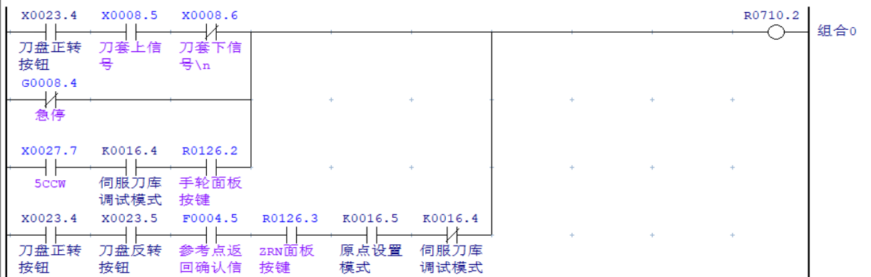 在 “模式選擇-M1”均為“1” “模式選擇-M0”均為“0”的狀態(tài)下,通過輸出“組合0”或“組合1”為“1”來試下刀盤的正反轉(zhuǎn),為避免在刀套打下的情況下轉(zhuǎn)動刀盤導(dǎo)致刀庫損壞需同時與刀套上下信號做互鎖處理。