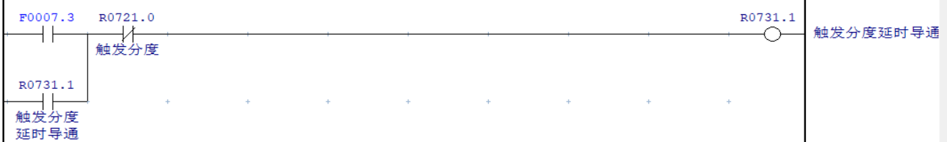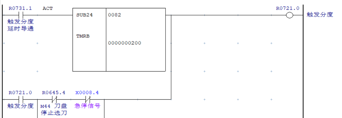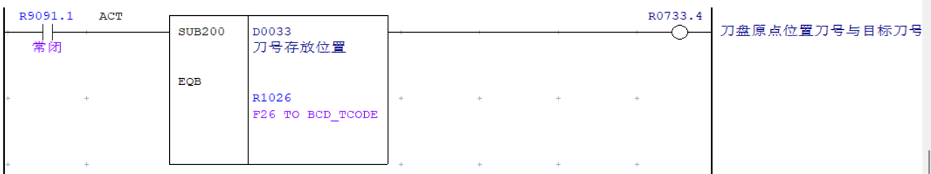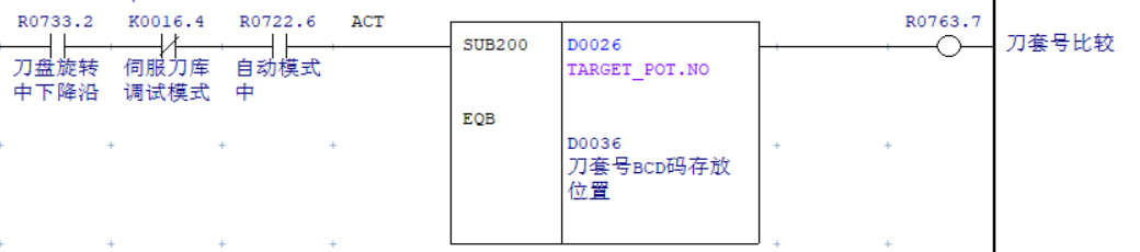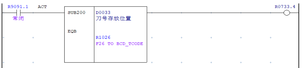 由于“自動分度模式”需在伺服驅(qū)動器在收到系統(tǒng)賦予的刀號后才能進行尋刀切該模式需觸發(fā)0.2秒以上才能進入,因此不能直接使用F7.3選刀信號進行觸發(fā)而使用中間繼電器,且延遲0.2秒導(dǎo)通并進行互鎖,確?!白詣臃侄饶J健笨梢哉S|發(fā)。刀盤選刀完成后導(dǎo)通SUB200功能指令進行刀盤換刀位置刀套內(nèi)刀號與目標(biāo)刀號的比較,一致時輸出R733.4信號打斷“自動分度模式” 互鎖,完成整個選刀過程。